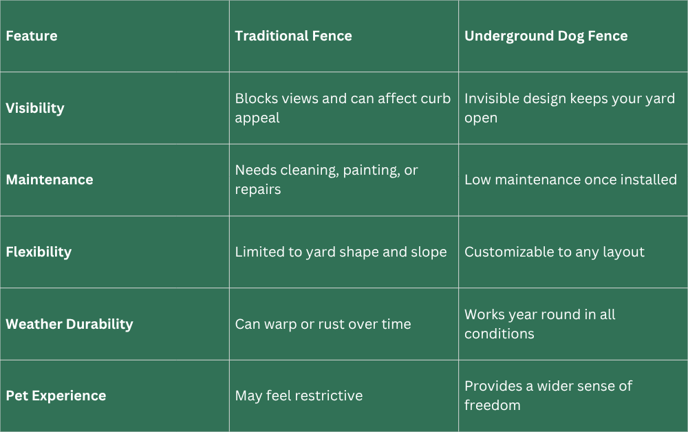 Traditional fences do their job well, but they don’t always fit every property. The comparison below shows how underground systems offer a smarter, more flexible solution.